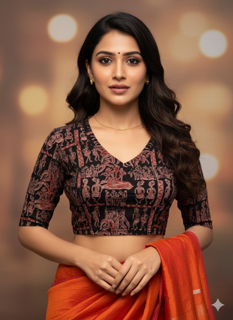 Crow Black Round Neck Cotton Stretchable Kalamkari Blouse