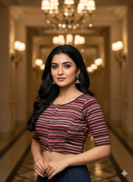 Brown and Beige V Neck Stretchable Kalamkari Blouse