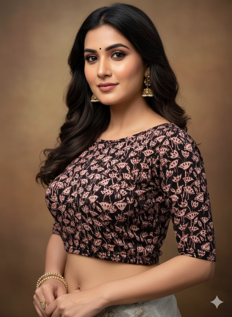 Sable Black Round Neck Cotton Stretchable Kalamkari Blouse