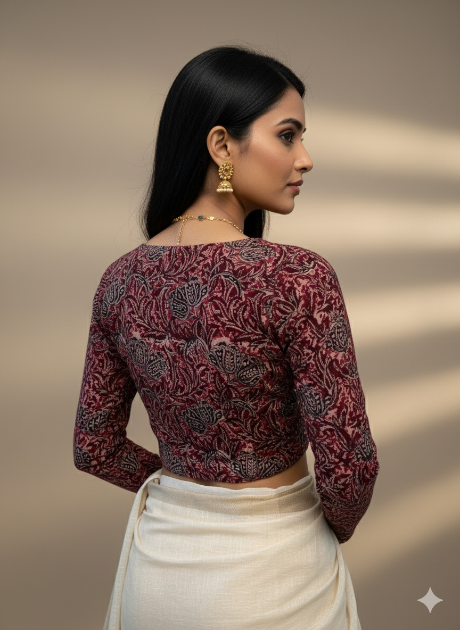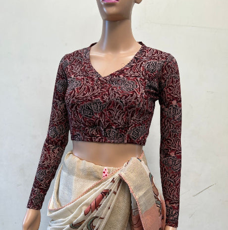 Deep Maroon V Neck Cotton Stretchable Kalamkari Blouse