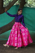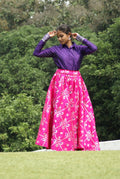 CUSTOMISED VIOLET-PINK COMBINATION LEHANGA SET. Blouse with collar neck and long sleeves adds the elegant touch and the ethnic lehenga takes centre stage in this ensemble, showcasing a seamless blend of violet and pink hues.