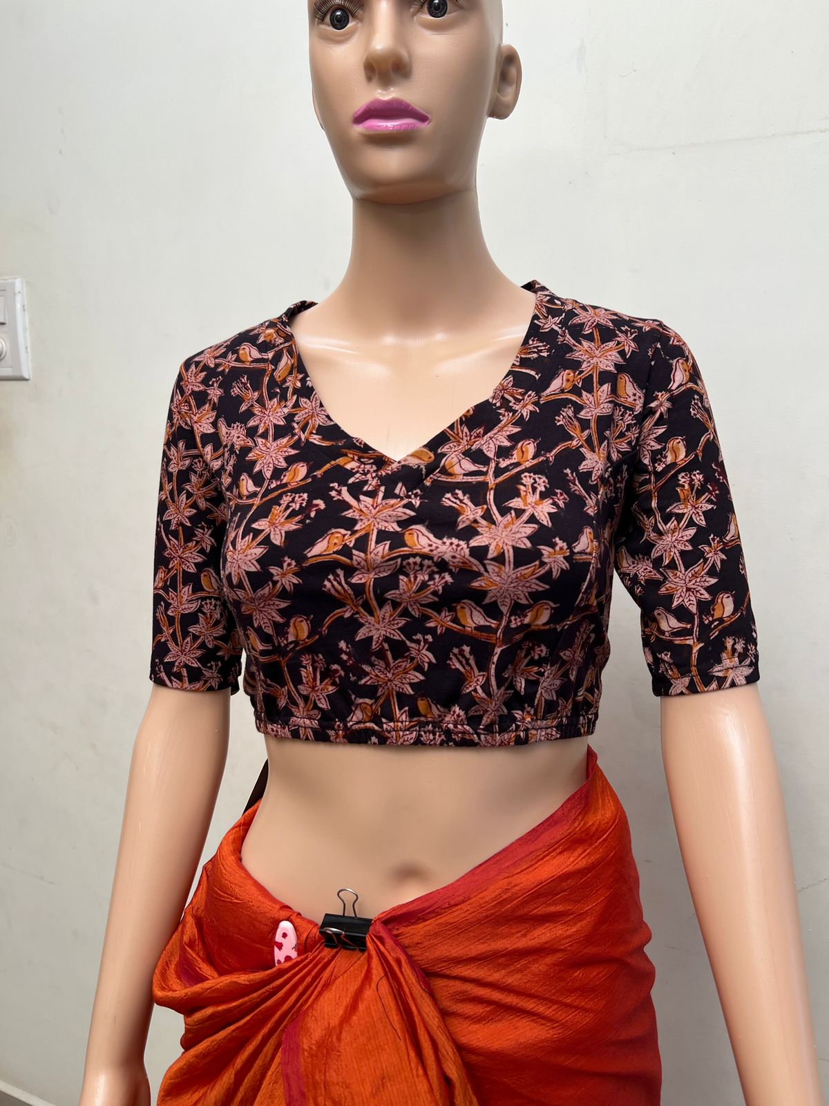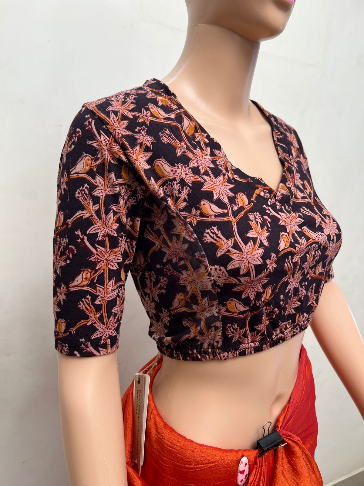 Midnight Black Round Neck Cotton Stretchable Kalamkari Blouse