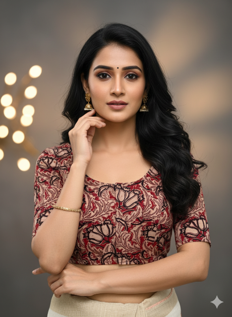 360° stretchable handcrafted Kalamkari blouse made with pure cotton ensures ultimate comfort and freedom of movement. Hand-printed with organic, chemical-free colors, the traditional Kalamkari block prints celebrate heritage artistry while being sustainable and eco-friendly. Stylish and trendy across generations, this blouse’s colors enhance beautifully with time when washed gently with non-chemical soaps, making each wear more vibrant. A timeless piece that combines craftsmanship, sustainability, and contemporary elegance for versatile styling.