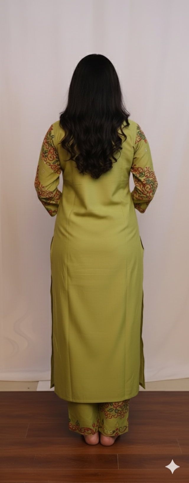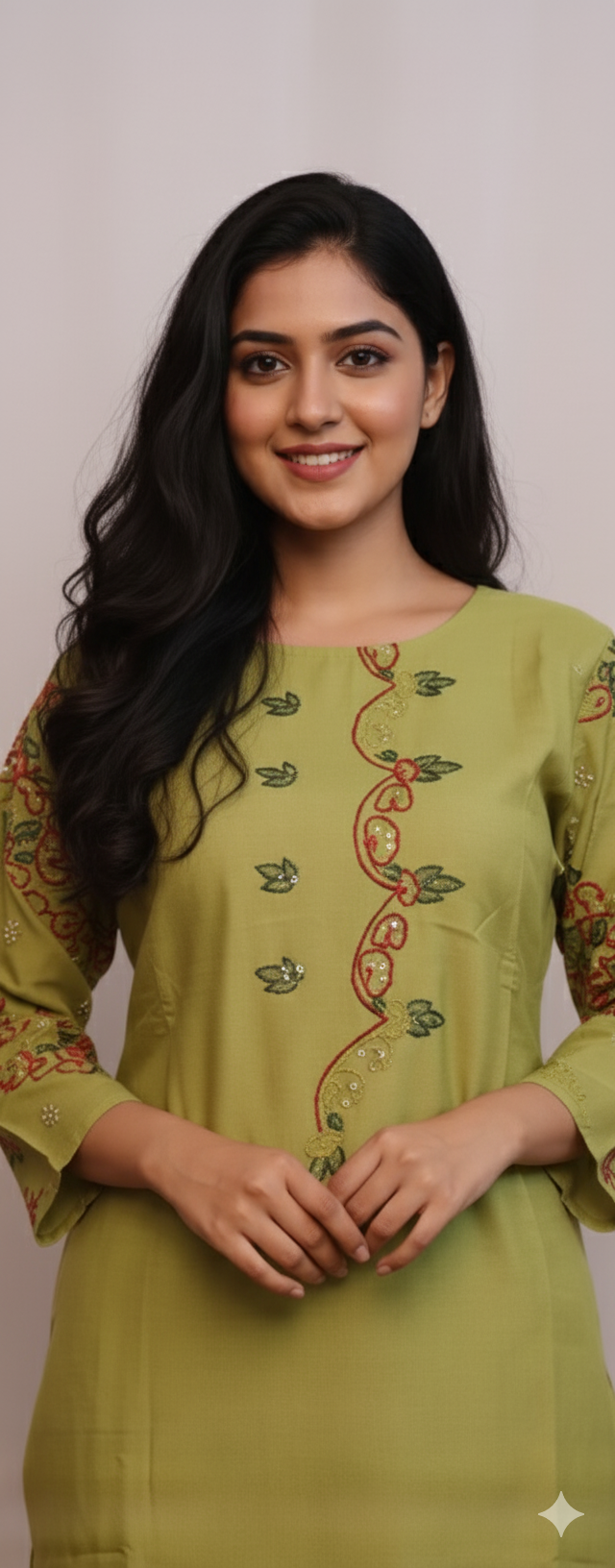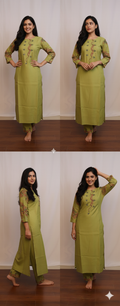 This parrot green kurti set features anchor thread embroidery, adding a touch of elegant craftsmanship to its vibrant color. The soft, breathable fabric ensures comfort, while the intricate embroidery enhances the overall design. Perfect for festive occasions, casual outings, or office wear.