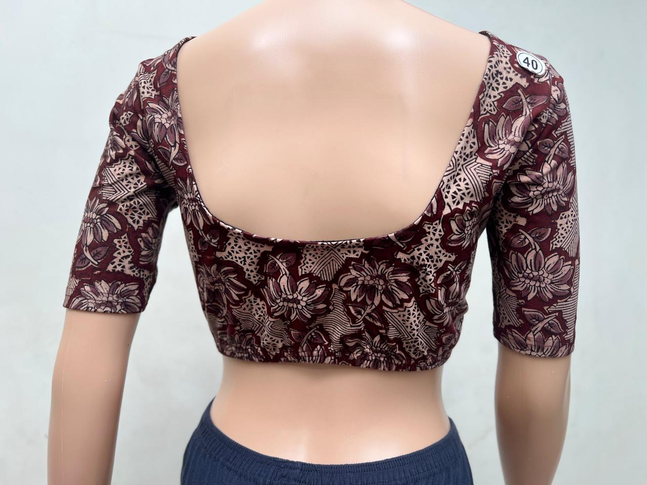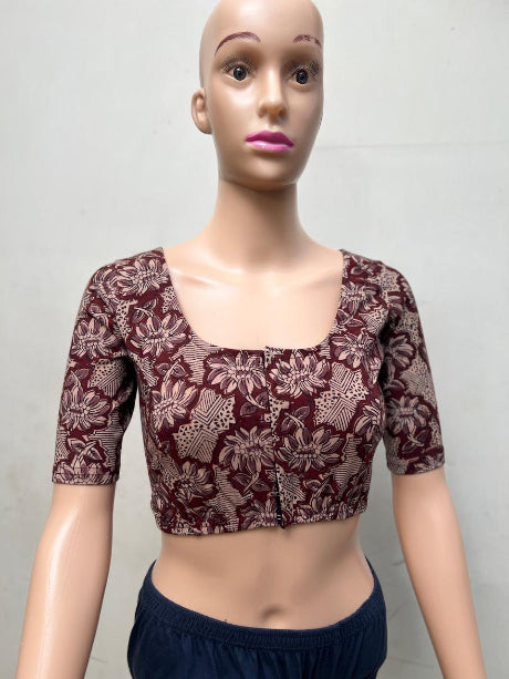 Pecan Brown Round Neck Cotton Stretchable Kalamkari Blouse