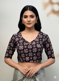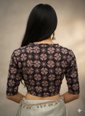 Black Beige V Neck Cotton Stretchable Kalamkari Blouse